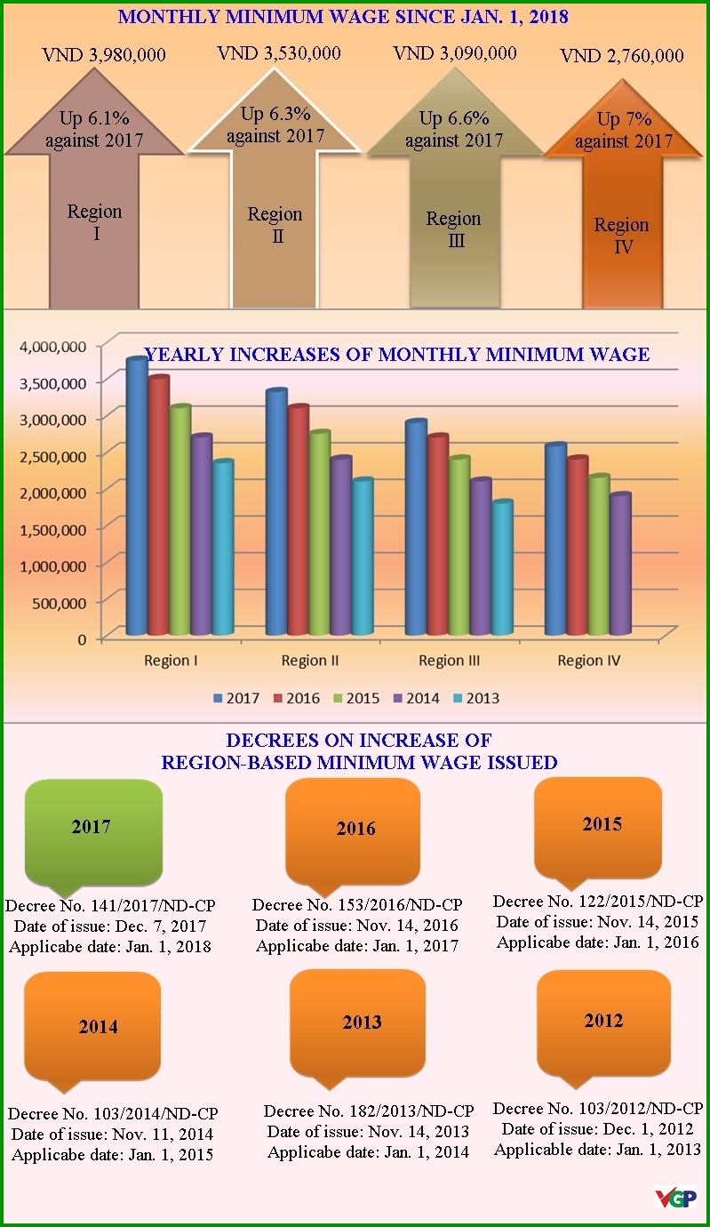 Under Government's Decree No. 141/2017/ND-CP, the region-based minimum wage shall be increased by between VND 180,000-230,000 from January 1, 2018.