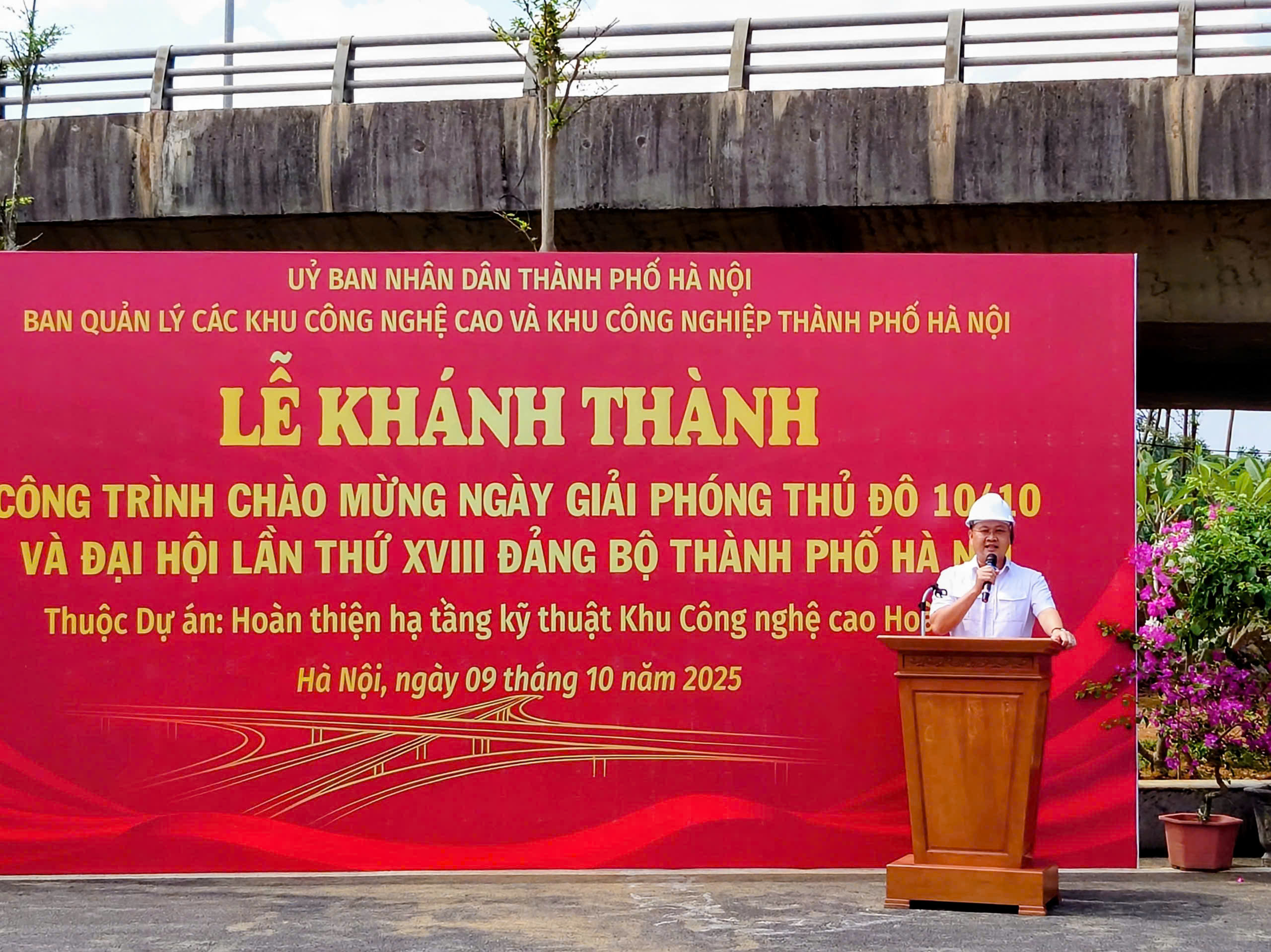 Phát biểu tại buổi lễ, ông Vũ Xuân Hùng cho biết công trình được khởi công vào ngày 26/3/2025, với quyết tâm cao, nỗ lực lớn, không quản nắng mưa, công trình đã hoàn thành vượt kế hoạch, Ông Hùng nhấn mạnh vai trò chiến lược của tuyến đường, là "cửa ngõ" kết nối trực tiếp Đại lộ Thăng Long với trục đường chính trong Khu CNC Hòa Lạc. Việc đưa tuyến đường này vào sử dụng được kỳ vọng sẽ đóng vai trò quan trọng trong quá trình phát triển và thu hút các nhà đầu tư mới vào Khu công nghệ cao Hoà Lạc. Công trình cũng là sự cam kết mạnh mẽ của Hà Nội trong phát triển hạ tầng đồng bộ, tạo thuận lợi cho các nhà đầu tư, khẳng định Khu công nghệ cao Hoà Lạc đã và đang sẵn sàng chào đón các doanh nghiệp công nghệ cao đến đầu tư tại Hà Nội.