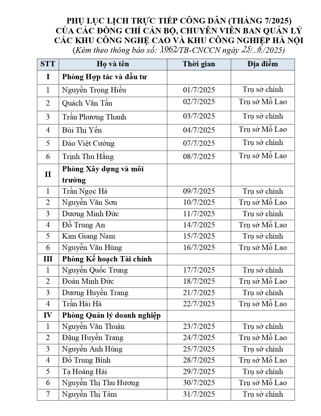 Thông báo lịch tiếp công dân, đại diện tổ chức, cá nhân, các doanh nghiệp trong Khu công nghệ cao, khu công nghiệp thuộc Thành phố của các đồng chí cán bộ, chuyên viên Ban Quản lý các KCNC & KCN TP Hà Nội tháng 7/2025