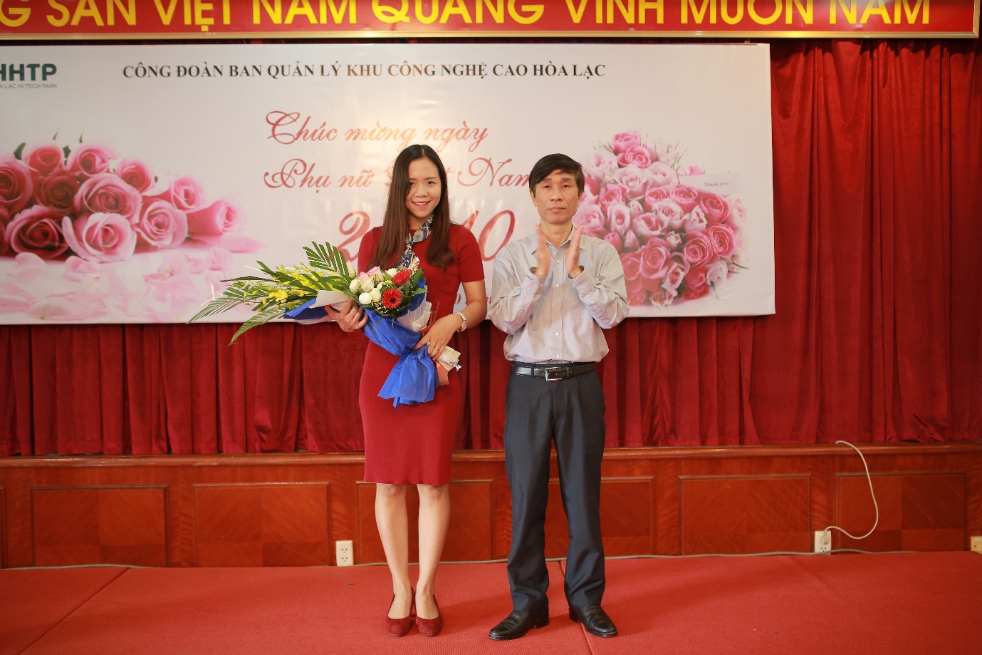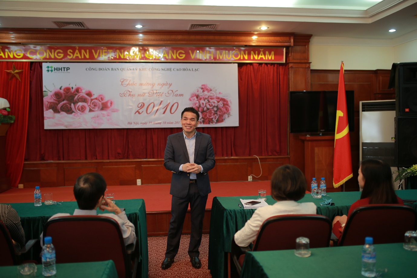 Sáng ngày 19/10/2017, buổi Mít-tinh đã diễn ra trong không khí trang trọng, đầm ấm nhưng cũng hết sức trẻ trung, vui vẻ. Đồng chí Nguyễn Trung Quỳnh, Phó trưởng Ban Quản lý, Chủ tịch Công đoàn Ban thay mặt Lãnh đạo Ban và toàn thể nam cán bộ Ban Quản lý đã gửi lời chúc, lời chia sẻ hết sức chân tình và mong toàn thể chị em cán bộ nữ của Ban Quản lý luôn luôn trẻ trung, xinh đẹp và nhiệt huyết đóng góp nhiều hơn nữa cho sự nghiệp phát triển của Khu Công nghệ cao Hoà Lạc.