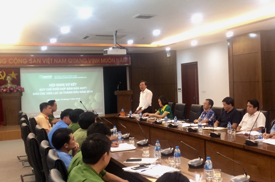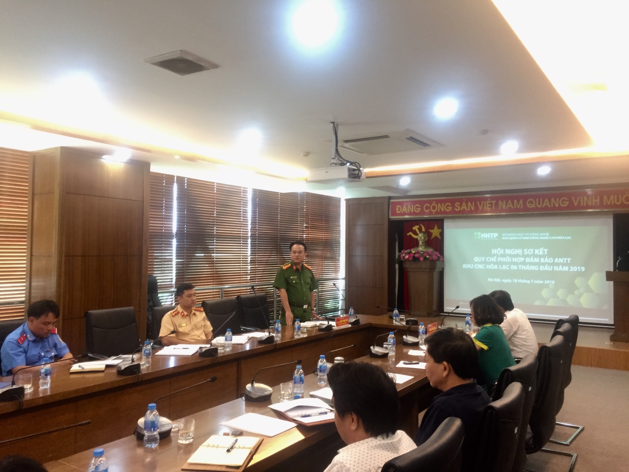 Nhằm đánh giá kết quả hoạt động 6 tháng đầu năm và thống nhất kế hoạch triển khai nhiệm vụ 6 tháng cuối năm 2019 việc thực hiện Quy chế phối hợp đảm bảo an ninh trật tự (ANTT) tại Khu CNC Hòa Lạc, ngày 18/7/2019, Ban Quản lý Khu CNC Hòa Lạc phối hợp với Công an huyện Thạch Thất, Công an huyện Quốc Oai, Thanh tra Giao thông, Thanh tra Xây dựng huyện Thạch Thất tổ chức Hội nghị Sơ kết thực hiện Quy chế phối hợp đảm bảo ANTT trong Khu CNC Hòa Lạc.