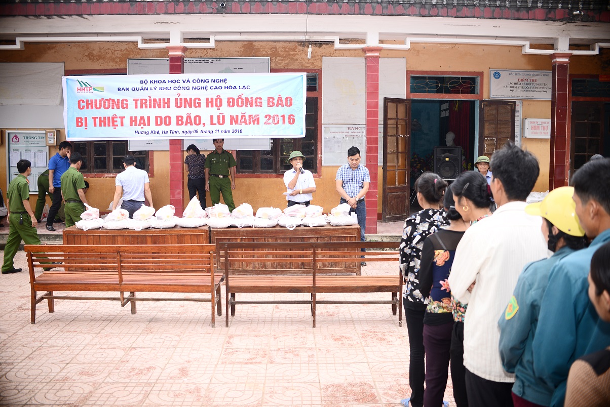 Với số tiền ủng hộ nhận được, ngày 06/11/2016, Ban Quản lý đã tổ chức đoàn công tác đến huyện Hương Khê, tỉnh Hà Tĩnh để trao tận tay 300 suất quà cho 300 hộ gia đình bị ảnh hưởng của bão và lũ, lụt trên địa bàn 3 xã gồm: Hương Giang, Gia Phố và Hương Trà, mỗi xã 100 suất. Một suất quà gồm: 500.000đ tiền mặt, 10 kg gạo trị giá 150.000đ, một gói nhu yếu phẩm (Dầu ăn, nước mắm, mỳ chính, muối bột canh, xà phòng tắm) trị giá 150.000đ.