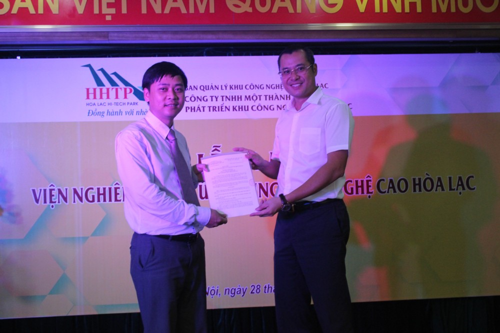 Ông Phạm Đại Dương, Thứ trưởng Bộ KH&CN, Trưởng Ban quản lý Khu CNC Hòa Lạc trao Quyết định thành lập Viện và giao nhiệm vụ cho ban Lãnh đạo Viện Viện Nghiên cứu và ứng dụng Công nghệ cao Hòa Lạc là đơn vị trực thuộc công ty, có tư cách pháp nhân đầy đủ và hạch toán độc lập. Phát biểu tại lễ ra mắt, ông Đinh Thành Long- Phó Viện trưởng Viện Nghiên cứu và ứng dụng Công nghệ cao Hòa Lạc cho biết một số định hướng cho hoạt động và phát triển Viện đó là: Mục tiêu tham gia và góp phần xây dựng cộng đồng KH&CN tại Khu Công Nghệ Cao Hòa Lạc. Viện phải phấn đấu trở thành hạt nhân tiêu biểu trong cộng đồng để hiện thực hóa các chủ trương, định hướng của các cấp Lãnh đạo Bộ, Ban Quản lý và Công ty trong định hướng phát triển chung của Khu Công nghệ cao Hòa Lạc.