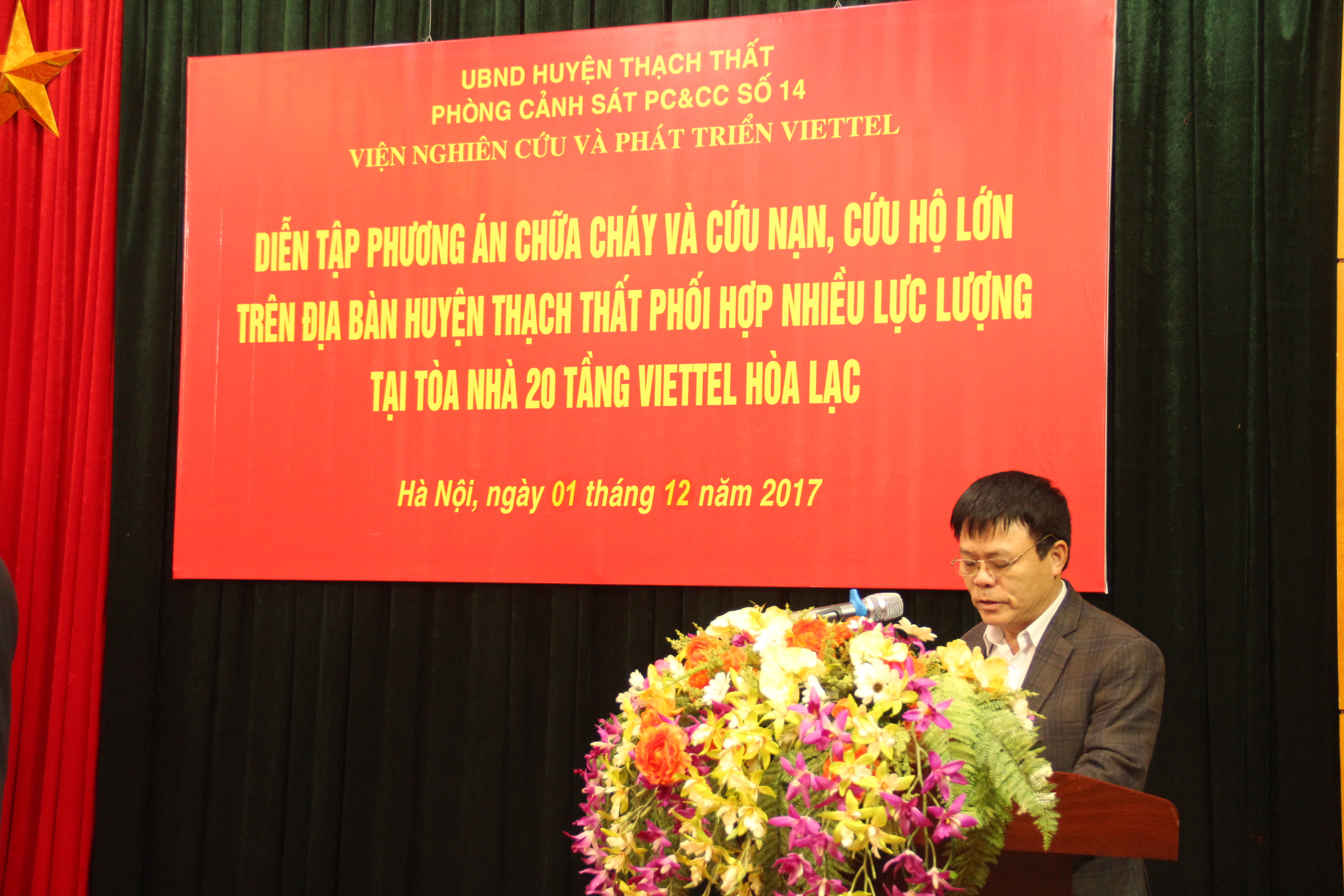 Phát biểu khai mạc buổi diễn tập, đồng chí Trần Đức Nguyên, Chủ tịch UBND huyện Thạch Thất đã nêu những đặc điểm nguy hiểm cháy nổ, tai nạn có thể xảy ra tại các khu vực huyện huyện Thạch Thất, đặc biệt là tại các làng nghề truyền thống sản xuất mây tre đan, đồ gỗ, gia công vật liệu dễ gây cháy… nhiều cơ sở sản xuất, kinh doanh  nhỏ hẹp, mật độ dân cư đông đúc đúc gây khó khăn trong việc tổ chức chữa cháy, qua đó đánh giá mức độ cần thiết để tổ chức diễn tập phương án chữa cháy, cứu nạn, cứu hộ, xử lý thảm hoạ, tai nạn nghiêm trọng trên địa bàn huyện; giao Phòng Cảnh sát PCCC số 14 triển khai phương án phối hợp với Công an huyện Thạch Thất, Viện Nghiên cứu và Phát triển Viettel, Trung tâm y tế huyện tổ chức tình huống giả định, diễn tập phương án phối hợp nhiều lực lượng tại Toà nhà Viettel Hòa Lạc - Khu Công nghệ cao Hòa Lạc.
