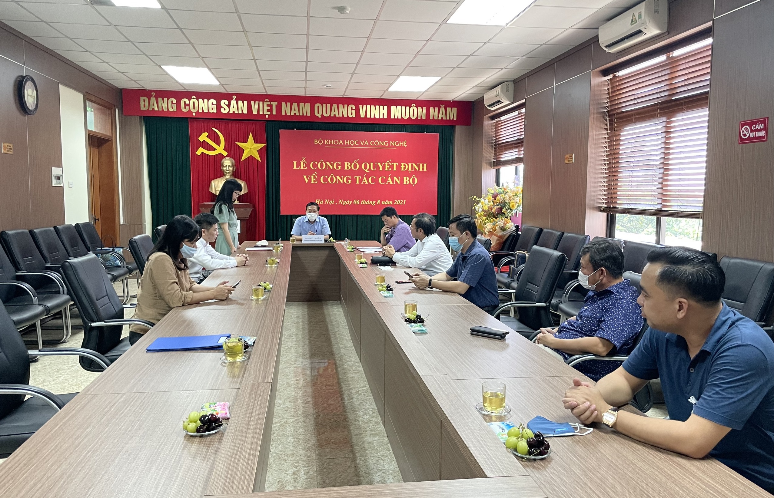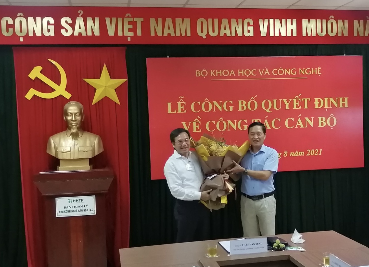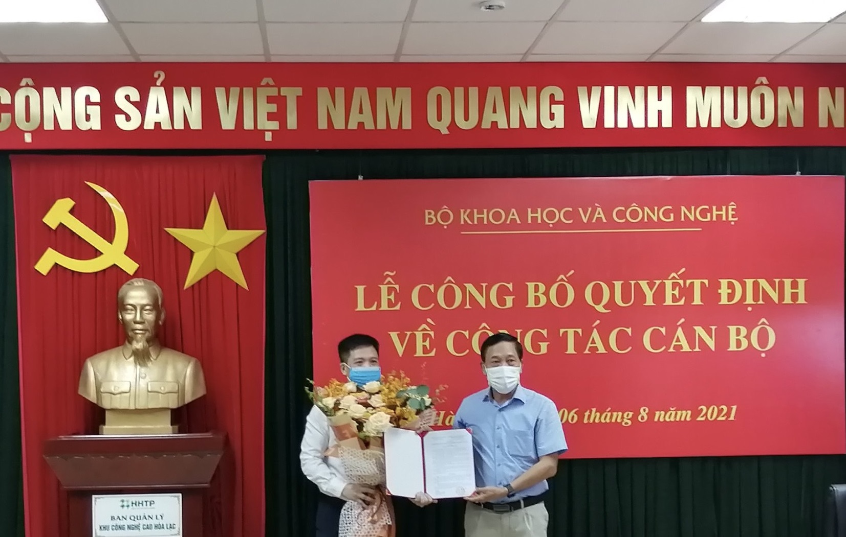 Chiều ngày 06/8/2021, tại Ban Quản lý Khu Công nghệ cao Hòa Lạc, Bộ Khoa học và Công nghệ (KH&CN) đã tổ chức Lễ công bố Quyết định về công tác cán bộ. Trong bối cảnh dịch COVID-19, buổi Lễ được tổ chức trong phạm vi hạn chế thành phần tham dự, đảm bảo giãn cách và phòng, chống dịch theo quy định.