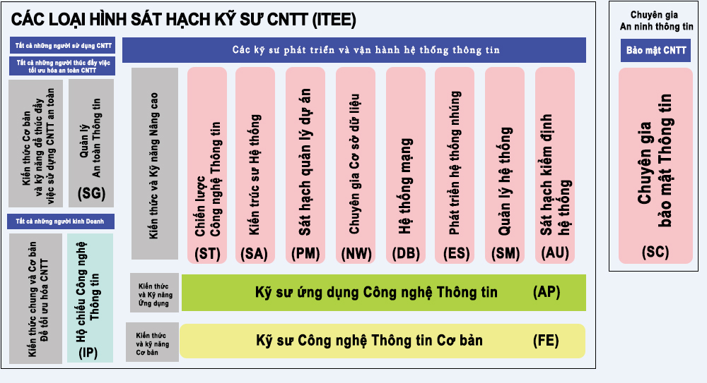 - FE (Kỹ sư CNTT Cơ bản - Fundamental IT Engineer): dành cho các đối tượng là những người có kiến thức, các kỹ năng cơ bản và khả năng ứng dụng thực tế.