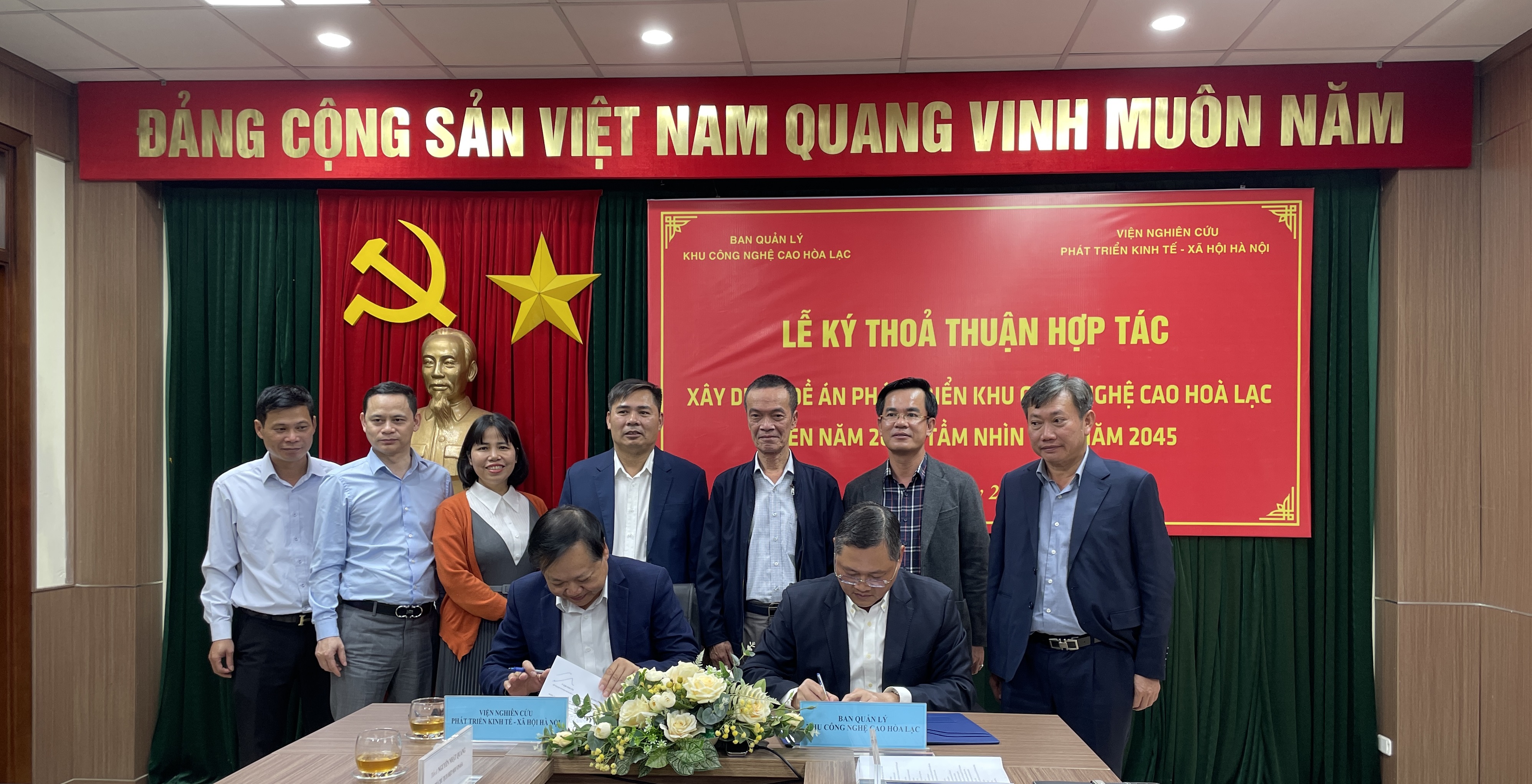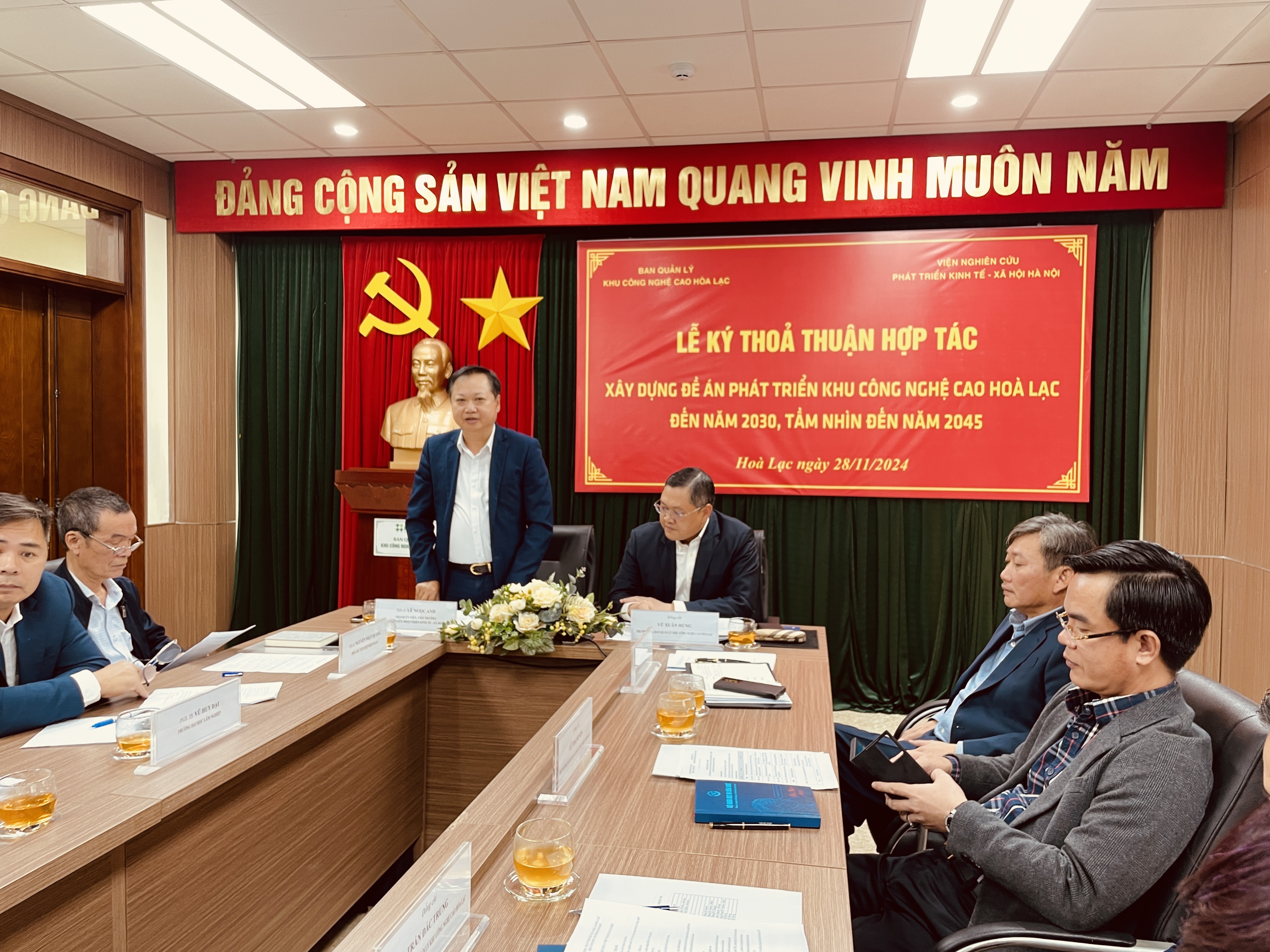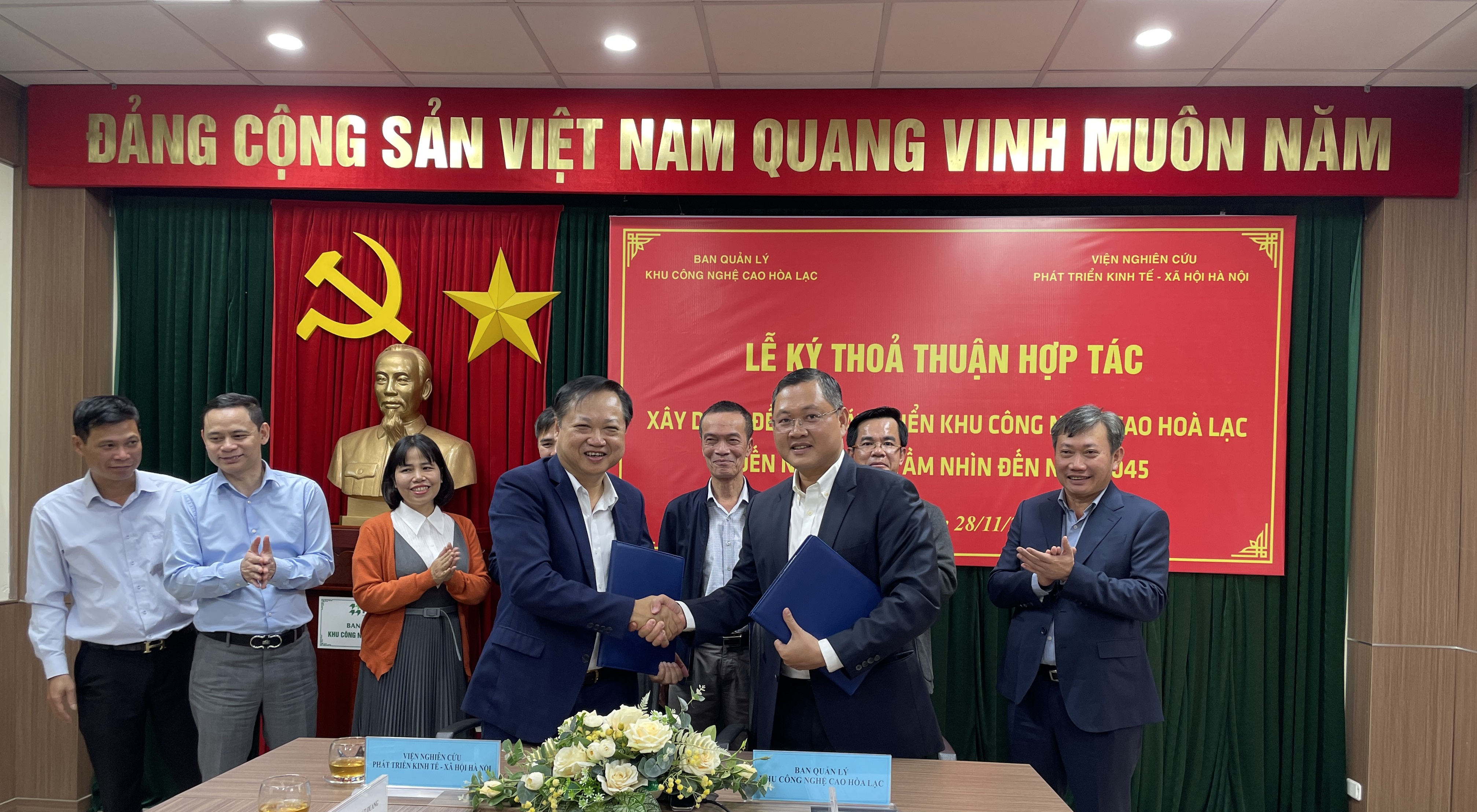 Triển khai Quyết định số 7845-QĐ/TU, ngày 28/11/2024, tại trụ sở Ban Quản lý Khu CNC Hòa Lạc đã diễn ra Lễ ký thỏa thuận hợp tác giữa Viện Nghiên cứu Phát triển Kinh tế - Xã hội Hà Nội và Ban Quản lý Khu Công nghệ cao Hòa Lạc về xây dựng Đề án Phát triển Khu Công nghệ cao Hòa Lạc đến năm 2030, tầm nhìn đến năm 2045. Tham dự Lễ ký kết có TS. Vũ Xuân Hùng, Trưởng ban Quản lý Khu Công nghệ cao Hòa Lạc, TS. Lê Ngọc Anh, Viện trưởng Viện Nghiên cứu Phát triển Kinh tế - Xã hội Hà Nội, một số chuyên gia đầu ngành trong lĩnh vực chuyển đối số và chuyển đổi xanh cùng đại diện lãnh đạo của hai cơ quan.